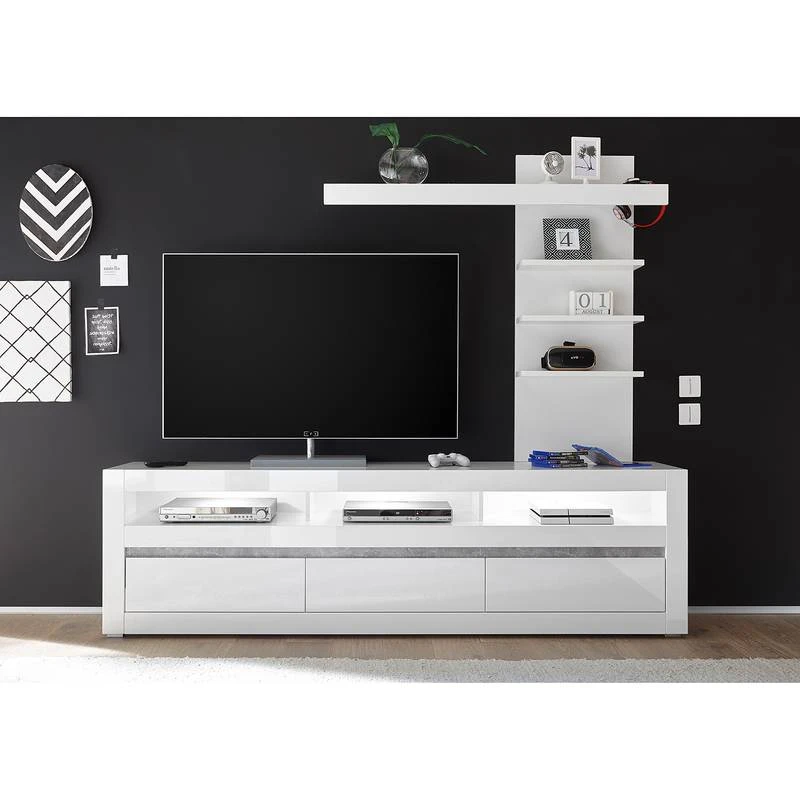 - Contenu de la livraison : Ensemble comprenant 1 tablette murale et 1 meuble TV sans éclairage ni accessoires