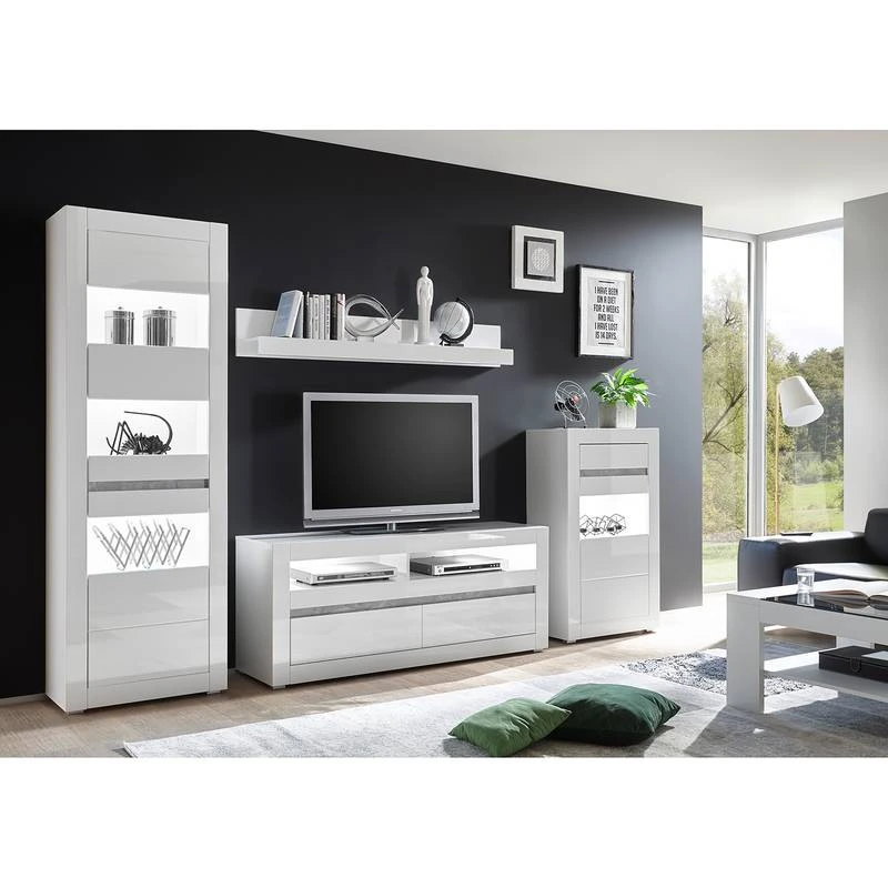 - Contenu de la livraison : Ensemble comprenant 1 vitrine, 1 tablette murale, 1 meuble TV et 1 commode, sans éclairage ni accessoires