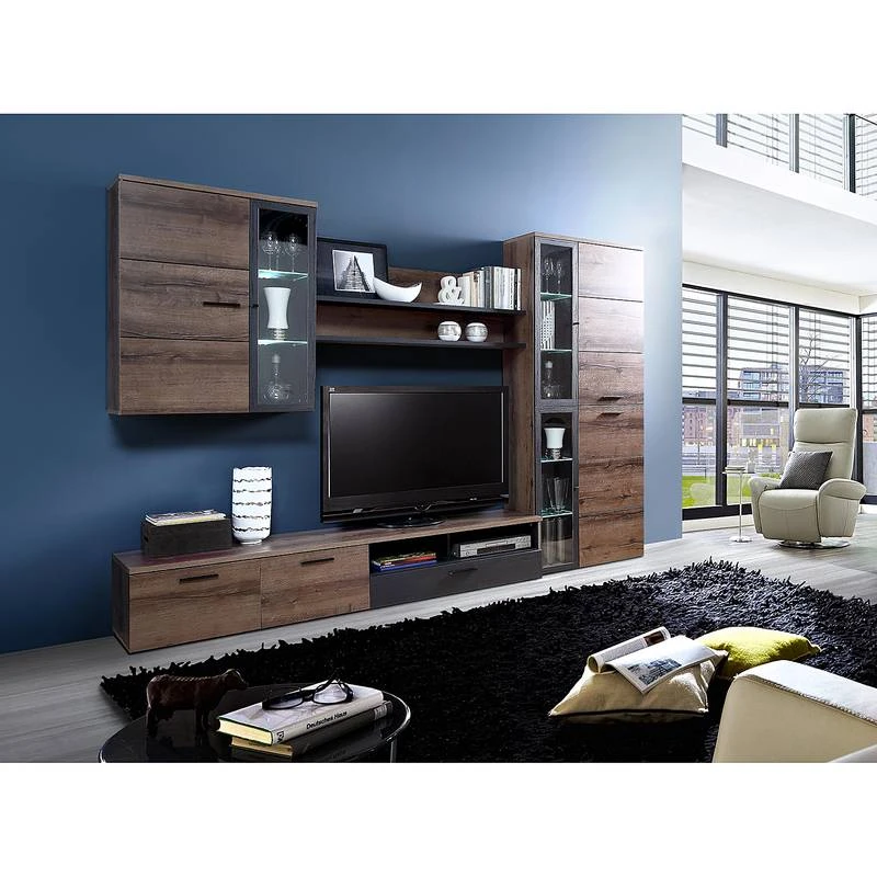 - Contenu de la livraison : Ensemble comprenant 1 armoire murale, 1 tablette murale, 1 meuble TV et 1 vitrine, avec éclairage, sans accessoires