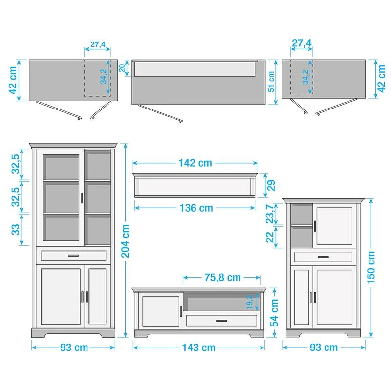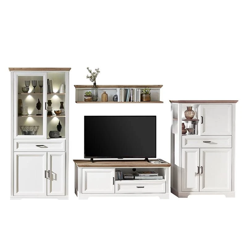 - Contenu de la livraison : Ensemble comprenant 1 vitrine, 1 buffet haut, 1 meuble TV et 1 étagère murale