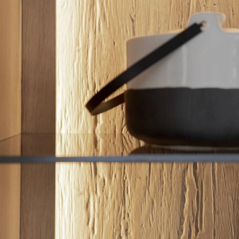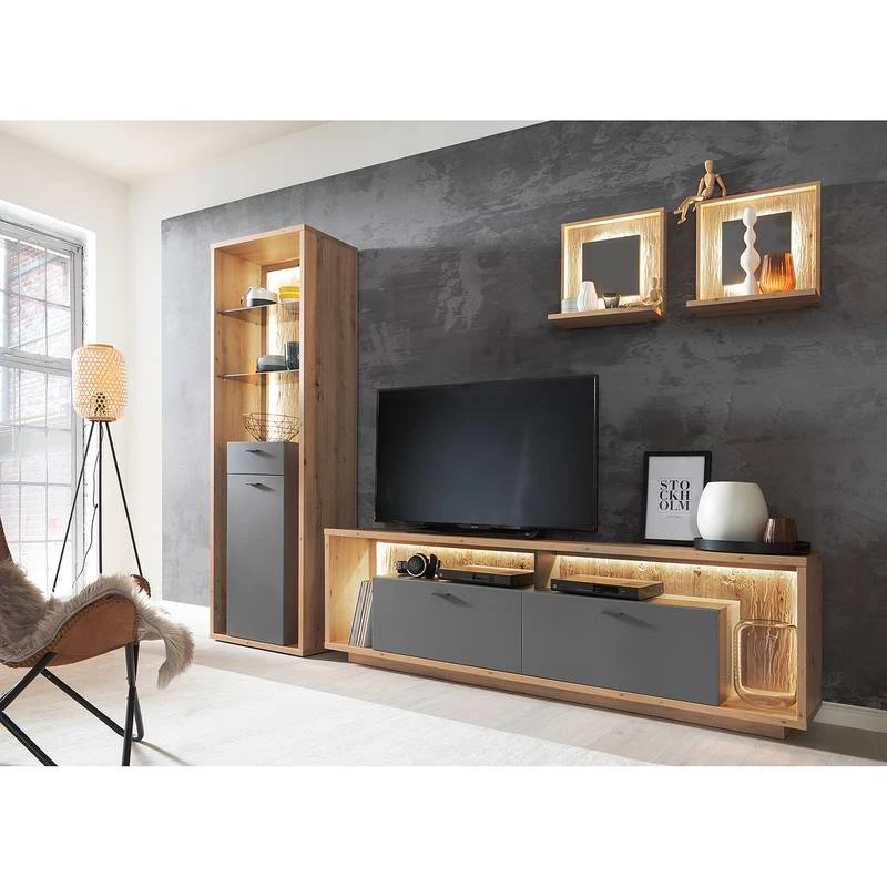- Contenu de la livraison : Ensemble comprenant 1 vitrine, 1 meuble TV et 2 étagères murales, sans éclairage ni accessoires
