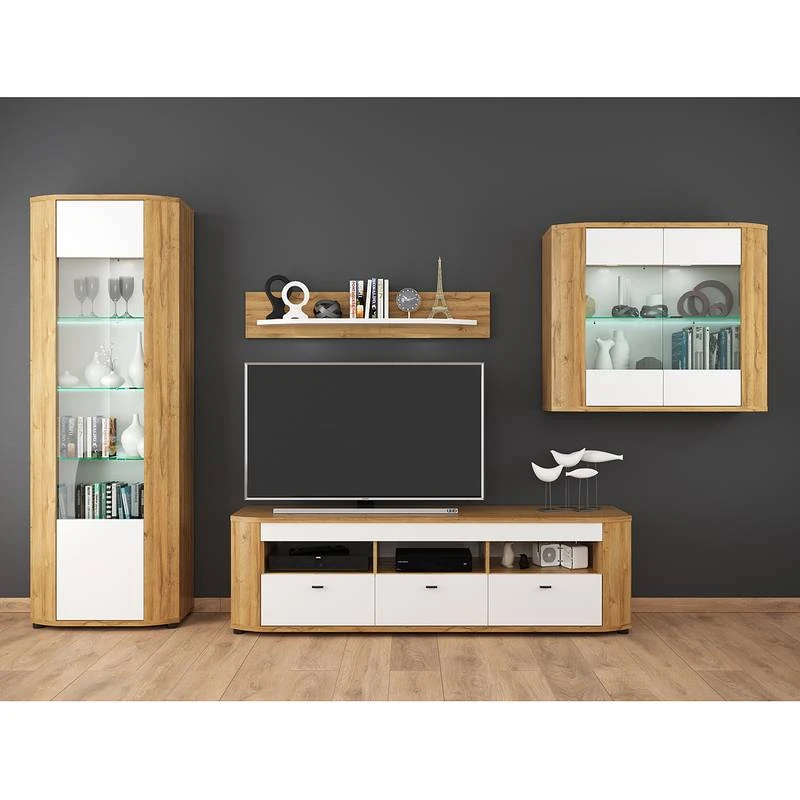 - Contenu de la livraison : Ensemble comprenant 1 meuble TV, 2 vitrines et 1 tablette murale