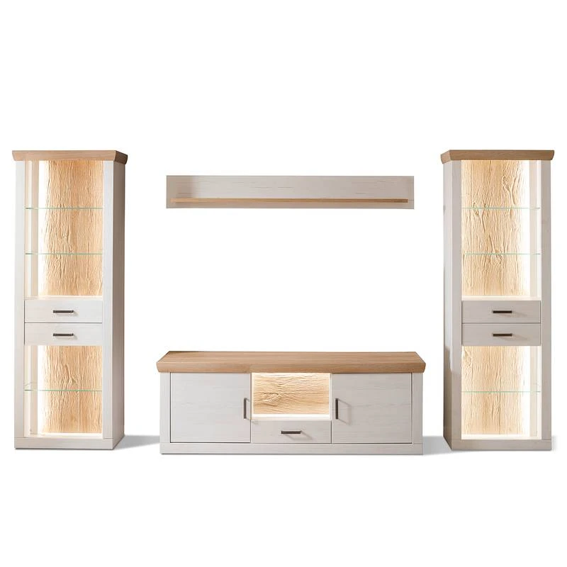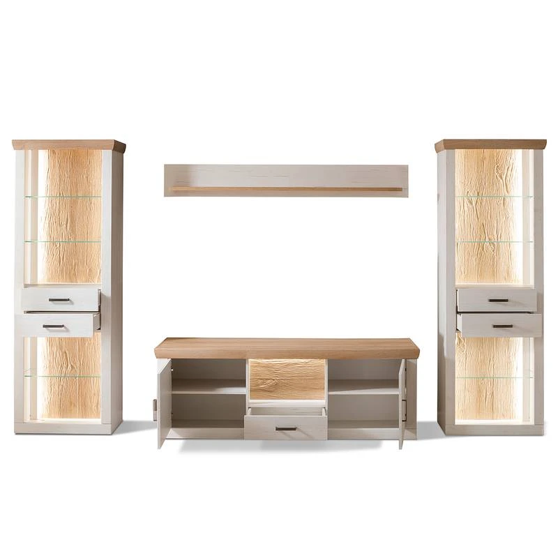 - Contenu de la livraison : Ensemble comprenant 2 vitrines, 1 meuble TV et 1 étagère murale, sans éclairage ni accessoires