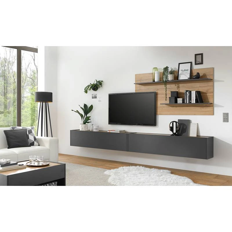 - Contenu de la livraison : Ensemble comprenant 1 étagère murale et 2 enfilades murales, sans éclairage ni accessoires