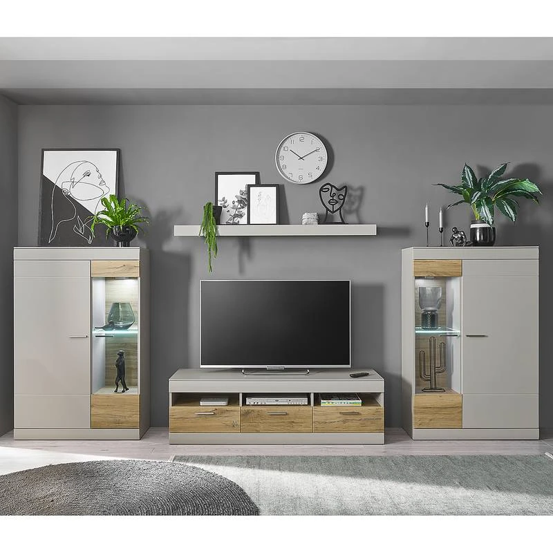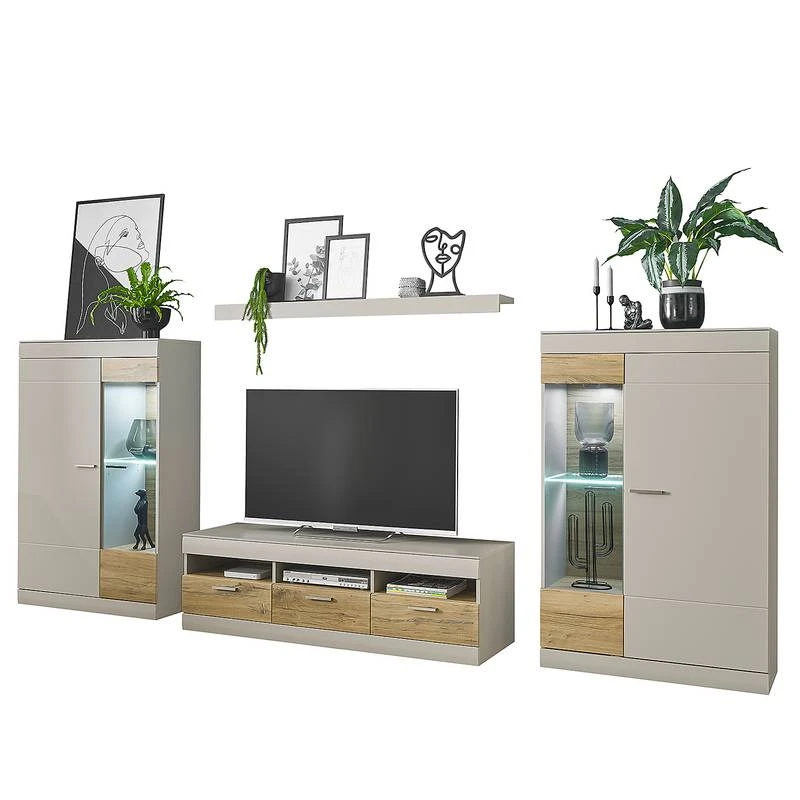 - Contenu de la livraison : Ensemble comprenant 2 buffets hauts, 1 tablette murale et 1 meuble TV, sans éclairage ni accessoires