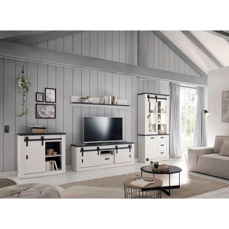 - Contenu de la livraison : Ensemble comprenant 1 vitrine, 1 tablette murale, 1 meuble TV et 1 buffet, sans éclairage ni accessoires