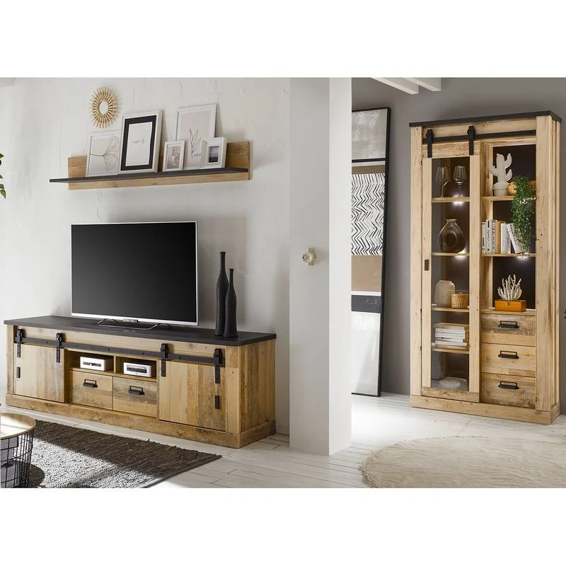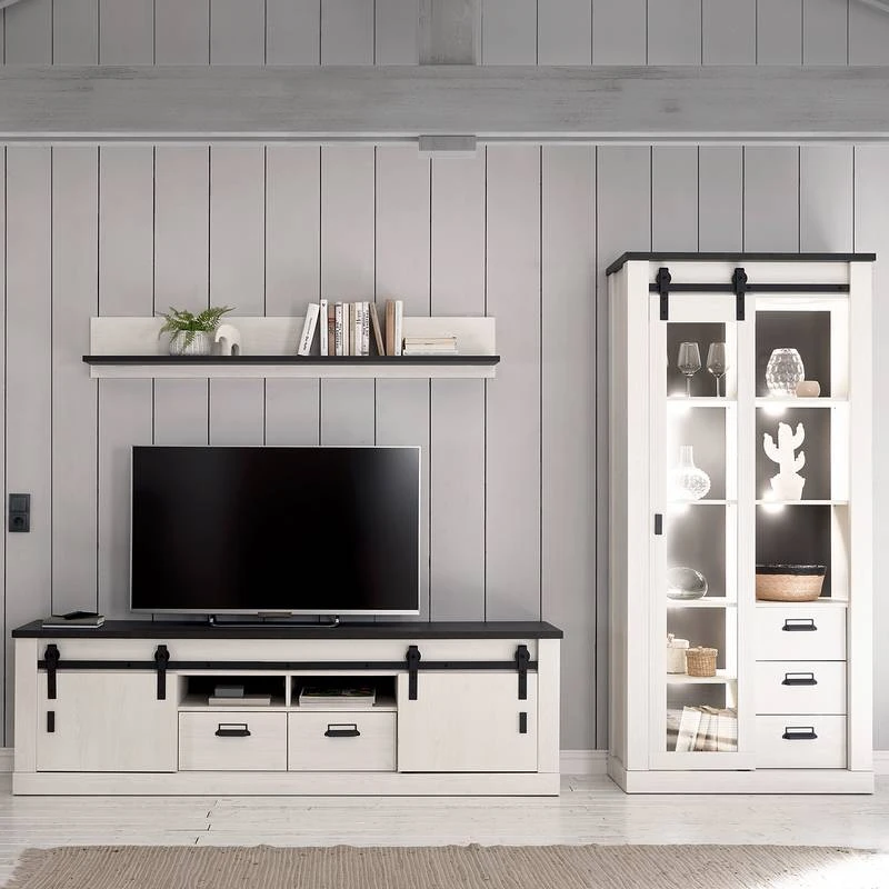 - Contenu de la livraison : Ensemble comprenant 1 tablette murale, 1 meuble TV et 1 vitrine, sans éclairage ni accessoires