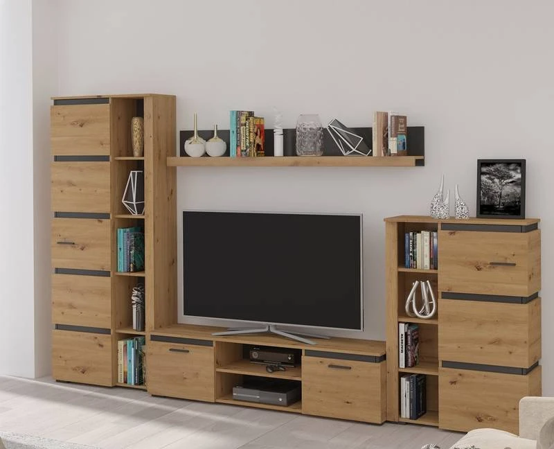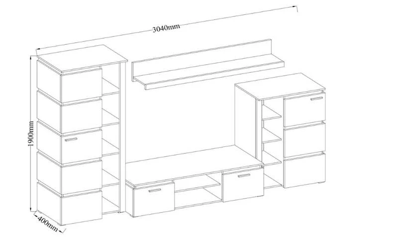 - Die Wohnzimmerwand überzeugt durch modernes Design, elegante Optik und unglaublich viel Stauraum. Die Wohnwand besteht aus 4 Elementen. Beim Kauf erhalten Sie eine TV-Kommode, ein hängendes Wandregal, eine Hochvitrine und eine halbhohe Vitrine. Die einzelnen Möbelelemente können auch zu einer Möbelwand mit den Abmessungen von mindestens B304 x H190 x T40 cm zusammengestellt werden. Da sich die Möbel in beliebigen Abständen voneinander arrangieren und an die Raumsituation individuell anpassen lassen, ist die Breite lediglich ein Orientierungswert.