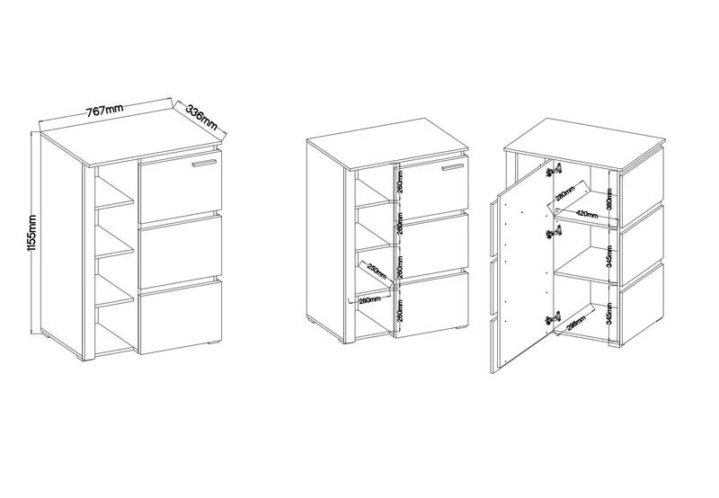 Die hohe Vitrine verfügt über fünf geschlossene und fünf offene Ablagefächer, die niedrige jeweils über drei Ablagefächer. Die eleganten Vitrinenschränke sind mit Flügeltüren ausgestattet und bieten den zusätzlichen Stauraum für Sachen, die nur ab und zu benötigt werden. Mit den offenen Fächern und dem hängenden Regalbrett erhalten Sie eine zusätzliche, sehr flexible Ablage für Dekoration, Blumen und Bücher. Der TV-Schrank ist für mittlere bis große Fernseher geeignet. Mit zwei Klapptüren und zwei offenen Ablagefächern in der Mitte bietet er genug Ablagemöglichkeiten für Multimediageräte, DVDs, CDs oder Zeitschriften. Der mittlere Bereich der TV-Kommode hat eine Rückwand, sodass sich der Kabelsalat perfekt dahinter verstecken lässt.